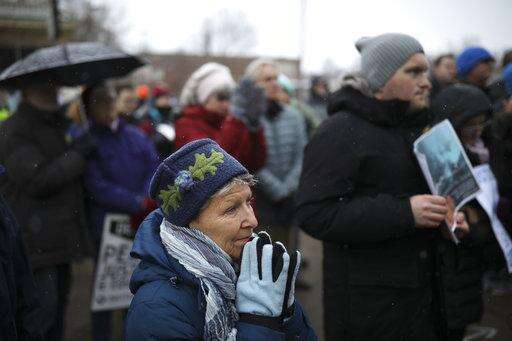 In this Tuesday, March 20, 2018, photo, a crowd listens as Katherine Hamberg speaks at the rally in Minneapolis, near where Justine Damond was shot last July. A Minneapolis police officer was charged Tuesday with murder and manslaughter in the fatal shooting of Damond, an unarmed Australian woman, minutes after she called 911 to report a possible sexual assault behind her home. (Jeff Wheeler/Star Tribune via AP) The Associated Press