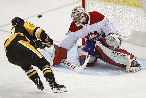 NOTES: The game featured a rarity: two penalty shots. Price easily stopped Pittsburgh's Derick Brassard in the first. DeSmith turned aside Gallagher in the second. ... Pittsburgh is 9-6-2 in the second night of back-to-backs. ... Montreal's 24 road losses are a franchise record. ... Linesman Steve Miller left late in the second period and missed several minutes after having his right hand gashed. Miller was back on the ice for the start of the third period.