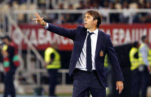 FILE - In this June 11, 2017 file photo, Spain's head coach Julen Lopetegui gives instructions to his players, during their World Cup Group G qualifying soccer match against Macedonia, at the Philip II National Stadium in Skopje, Macedonia. Spain enters the final stage of its World Cup preparations with coach Julen Lopetegui experimenting up front. Lopetegui has called up several different forwards since taking over the national squad and has plenty of options to choose from before announcing the final list for Russia in a few months. (AP Photo/Boris Grdanoski, File) The Associated Press