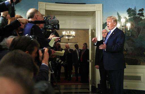 President Donald Trump with, Vice President Mike Pence, responds to reporters' questions in the Diplomatic Room of the White House in Washington, Friday, March 23, 2018, after he spoke about the $1.3 trillion spending bill he signed earlier in the day. (AP Photo/Manuel Balce Ceneta) The Associated Press