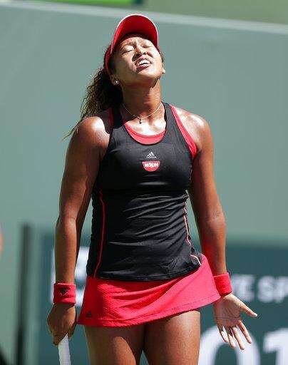 Naomi Osaka, of Japan, reacts after missing a point against Elina Svitolina, of Ukraine, during the Miami Open tennis tournament, Friday, March 23, 2018, in Key Biscayne, Fla. (AP Photo/Lynne Sladky) The Associated Press