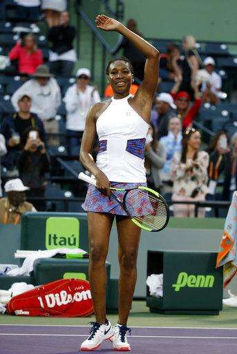 Venus Williams celebrates after defeating Natalia Vikhlyantseva, of Russia, in a tennis match at the Miami Open, Friday, March 23, 2018, in Key Biscayne, Fla. (AP Photo/Wilfredo Lee) The Associated Press
