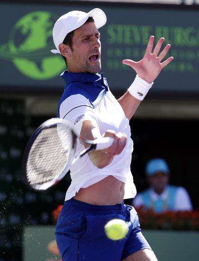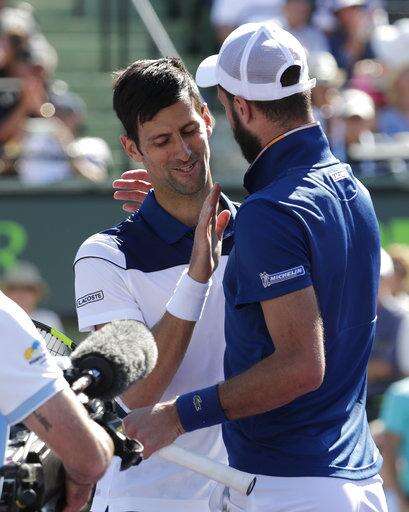 Novak Djokovic, of Serbia, returns to Benoit Paire, of France, during the Miami Open tennis tournament, Friday, March 23, 2018, in Key Biscayne, Fla. Paire won 6-3, 6-4. (AP Photo/Lynne Sladky) The Associated Press