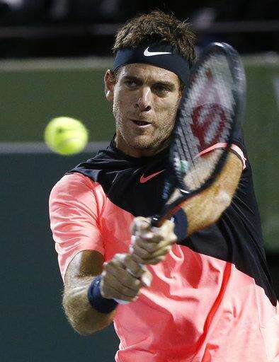 Juan Martin del Potro, of Argentina, returns a shot from Robin Haase, of the Netherlands, at the Miami Open tennis tournament Friday, March 23, 2018, in Key Biscayne, Fla. (AP Photo/Wilfredo Lee) The Associated Press