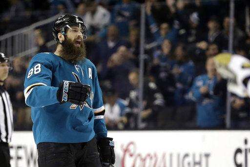 San Jose Sharks' Brent Burns celebrates after scoring against the Vegas Golden Knights during the second period of an NHL hockey game Thursday, March 22, 2018, in San Jose, Calif. (AP Photo/Marcio Jose Sanchez) The Associated Press