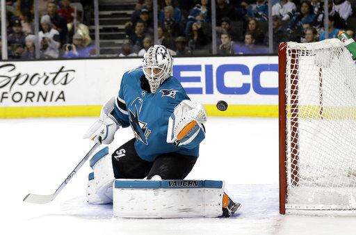 San Jose Sharks goaltender Martin Jones stops a shot during the first period of an NHL hockey game against the Vegas Golden Knights on Thursday, March 22, 2018, in San Jose, Calif. (AP Photo/Marcio Jose Sanchez) The Associated Press