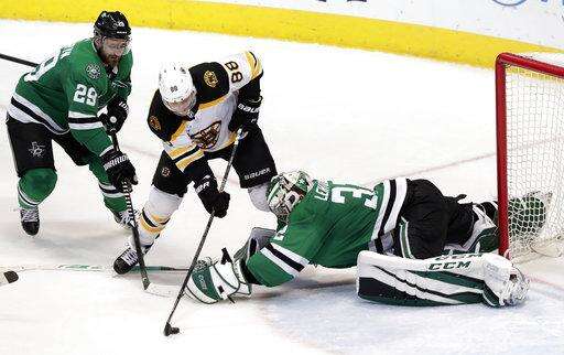 With only seconds remaining, a scramble followed a faceoff in the Dallas end, and Marchand passed to Pastrnak in front. While falling down, he put the puck past Stars goalie Kari Lehtonen.