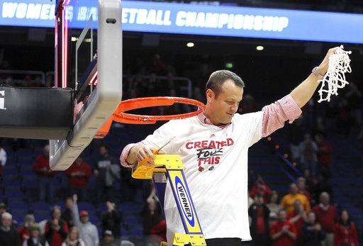 Louisville head coach Jeff Walz holds up the net after winning an NCAA women's college basketball tournament regional final over Oregon State 76-43, Sunday, March 25, 2018, in Lexington, Ky. (AP Photo/James Crisp) The Associated Press