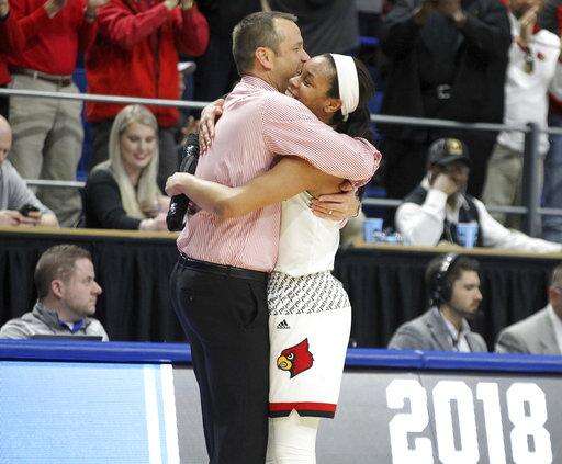Louisville's head coach Jeff Walz, left, hugs Asia Durr in the closing moments of an NCAA women's college basketball tournament regional final against Oregon State, Sunday, March 25, 2018, in Lexington, Ky. Louisville won 76-43.(AP Photo/James Crisp) The Associated Press