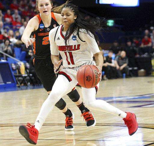 Louisville's Arica Carter (11) drives past Oregon State's Kat Tudor during the second half of an NCAA women's college basketball tournament regional final, Sunday, March 25, 2018, in Lexington, Ky. Louisville won 76-43.(AP Photo/James Crisp) The Associated Press