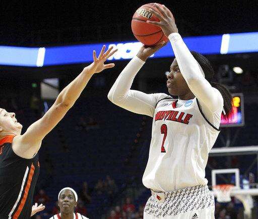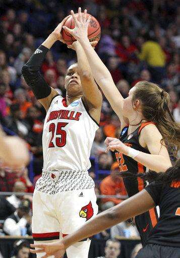 Louisville's Myisha Hines-Allen, right, shoots while pressured by Oregon State's Mikayla Pivec, left, during the second half of an NCAA women's college basketball tournament regional final, Sunday, March 25, 2018, in Lexington, Ky. Louisville won 76-43.(AP Photo/James Crisp) The Associated Press