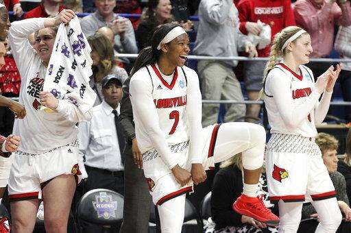 From left, Louisville's Loretta Kakala, Myisha Hines-Allen and Sam Fuehring celebrate late in the second half of an NCAA women's college basketball tournament regional final, Sunday, March 25, 2018, in Lexington, Ky. Louisville won 76-43.(AP Photo/James Crisp) The Associated Press