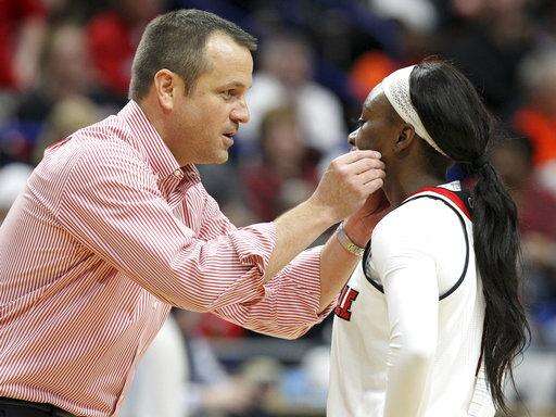 Louisville's head coach Jeff Walz instructs Dana Evans during the second half of an NCAA women's college basketball tournament regional final against Oregon State, Sunday, March 25, 2018, in Lexington, Ky. Louisville won 76-43.(AP Photo/James Crisp) The Associated Press
