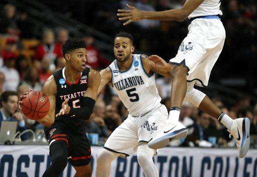 Texas Tech's Justin Gray, left, tries to pass as Villanova's Phil Booth, center, defends during the first half of an NCAA men's college basketball tournament regional final, Sunday, March 25, 2018, in Boston. (AP Photo/Charles Krupa) The Associated Press