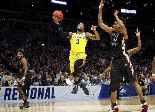 Michigan guard Zavier Simpson (3) shoots against Florida State center Ike Obiagu (12) during the first half of an NCAA men's college basketball tournament regional final Saturday, March 24, 2018, in Los Angeles. (AP Photo/Jae Hong) The Associated Press
