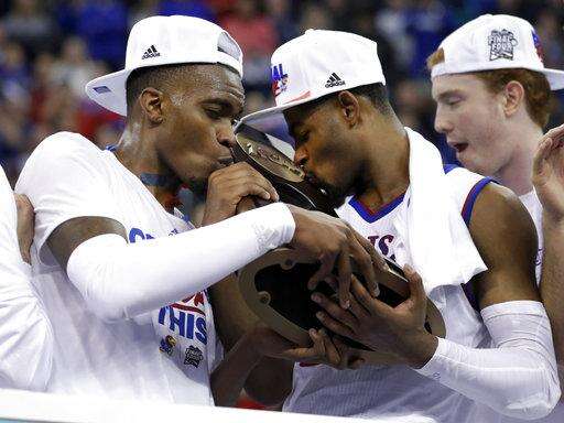 Kansas' Lagerald Vick, left, and Malik Newman kiss the trophy after defeating Duke 85-81 in overtime a regional final game in the NCAA men's college basketball tournament Sunday, March 25, 2018, in Omaha, Neb. (AP Photo/Charlie Neibergall) The Associated Press