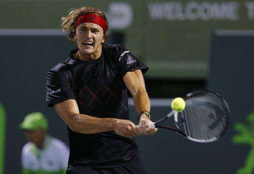 Alexander Zverev, of Germany, returns the ball to David Ferrer, of Spain, during the Miami Open tennis tournament, Monday, March 26, 2018, in Key Biscayne, Fla. (AP Photo/Joe Skipper) The Associated Press