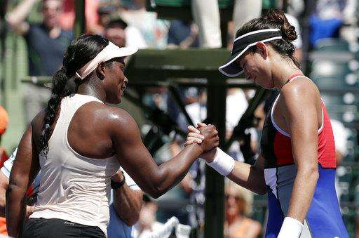 Sloane Stephens, left, shakes hands with Garbine Muguruza, of Spain, after winning their match at the Miami Open tennis tournament, Monday, March 26, 2018, in Key Biscayne, Fla. Stephens won 6-3, 6-4. (AP Photo/Lynne Sladky) The Associated Press