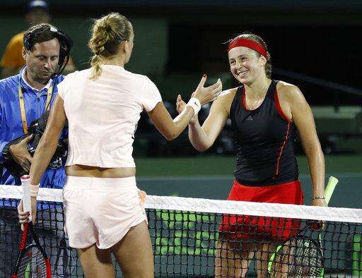 Jelena Ostapenko, right, of Latvia, is congratulated by Petra Kvitova, of the Czech Republic, after Ostapenko's 7-6, 6-3 win during the Miami Open tennis tournament, Monday, March 26, 2018, in Key Biscayne, Fla. (AP Photo/Joe Skipper) The Associated Press