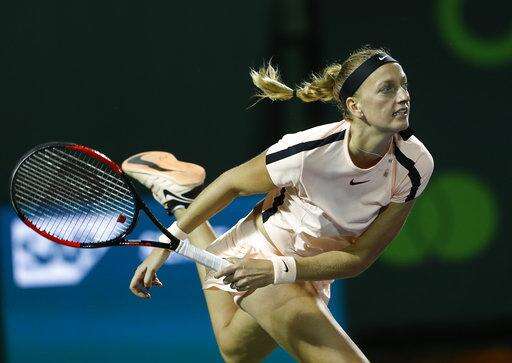 Petra Kvitova of the Czech Republic follows through on her serve to Jelena Ostapenko of Latvia during the Miami Open tennis tournament, Monday, March 26, 2018, in Key Biscayne, Fla. (AP Photo/Joe Skipper) The Associated Press