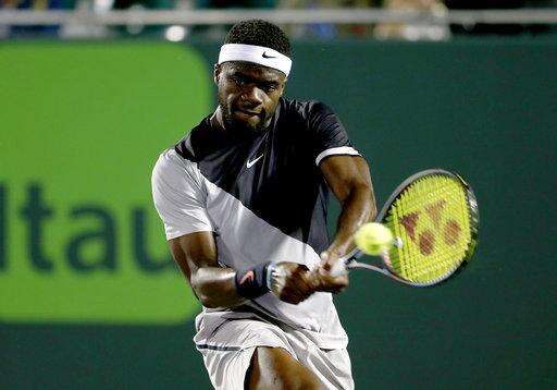 Frances Tiafoe returns the ball to Tomas Berdych, of the Czech Republic, during the Miami Open tennis tournament, Monday, March 26, 2018, in Key Biscayne, Fla. (AP Photo/Joe Skipper) The Associated Press