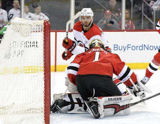 New Jersey Devils goaltender Keith Kinkaid (1) deflects a shot by Carolina Hurricanes left wing Phillip Di Giuseppe (34) during the first period of an NHL hockey game Tuesday, March 27, 2018, in Newark, N.J. (AP Photo/Bill Kostroun) The Associated Press