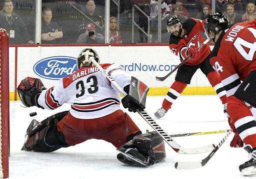 New Jersey Devils right wing Kyle Palmieri (21) scores a goal past Carolina Hurricanes goaltender Scott Darling (33) during the second period of an NHL hockey game Tuesday, March 27, 2018, in Newark, N.J. The Devils won 4-3.(AP Photo/Bill Kostroun) The Associated Press