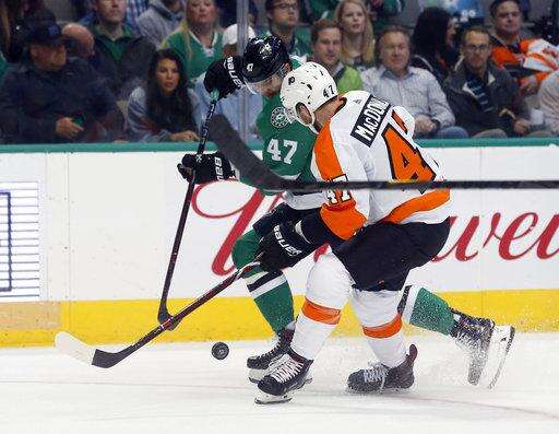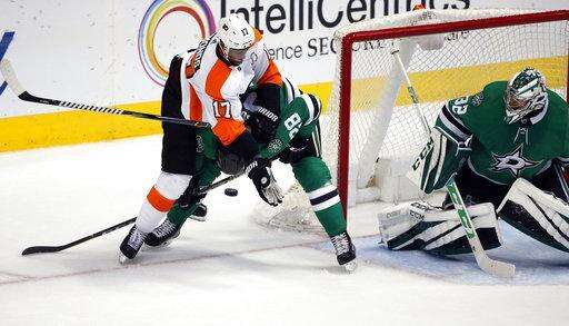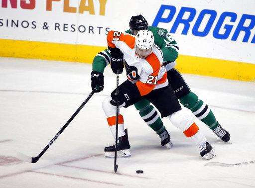 Philadelphia Flyers center Scott Laughton (21) fights for possession of the puck as he is defended by Dallas Stars center Jason Dickinson (16) during the second period of an NHL hockey game in Dallas, Tuesday, March. 27, 2018. (AP Photo/Michael Ainsworth) The Associated Press