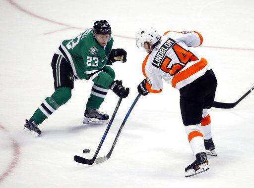 Dallas Stars defenseman Esa Lindell (23) defends Philadelphia Flyers left wing Oskar Lindblom (54) during the second period of an NHL hockey game in Dallas, Tuesday, March. 27, 2018. (AP Photo/Michael Ainsworth) The Associated Press