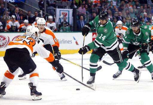 Dallas Stars left wing Jamie Benn (14) gets a shot on goal as Philadelphia Flyers defenseman Shayne Gostisbehere (53) defends him during the first period of an NHL hockey game in Dallas, Tuesday, March. 27, 2018. (AP Photo/Michael Ainsworth) The Associated Press