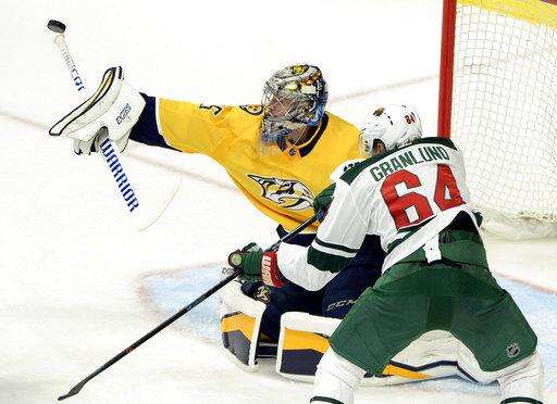 Nashville Predators goaltender Pekka Rinne (35), of Finland, blocks a shot with his stick as Minnesota Wild right wing Mikael Granlund (64), of Finland, looks for the rebound during the second period of an NHL hockey game Tuesday, March 27, 2018, in Nashville, Tenn. (AP Photo/Mark Zaleski) The Associated Press