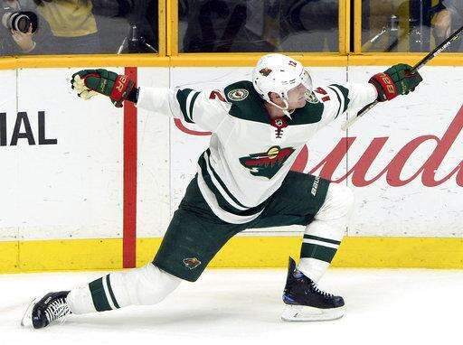 Minnesota Wild center Eric Staal celebrates after scoring a goal to tie the score against the Nashville Predators during the third period of an NHL hockey game Tuesday, March 27, 2018, in Nashville, Tenn. The Predators won in a shootout. (AP Photo/Mark Zaleski) The Associated Press