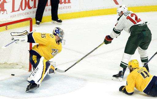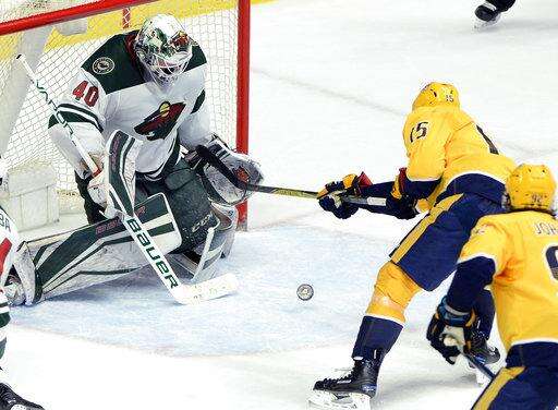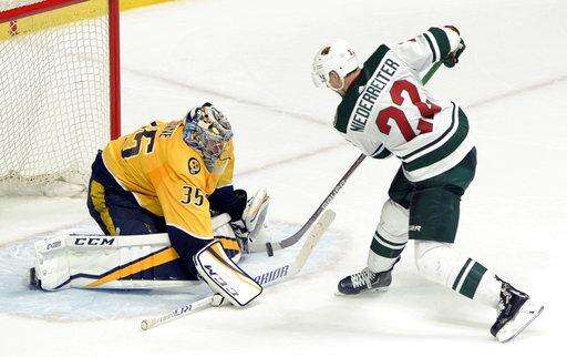 Nashville Predators goaltender Pekka Rinne (35), of Finland, blocks a shot by Minnesota Wild right wing Nino Niederreiter (22), of Switzerland, during the shootout in an NHL hockey game Tuesday, March 27, 2018, in Nashville, Tenn. Ring stopped all three attempts by Minnesota. The Predators won 2-1. (AP Photo/Mark Zaleski) The Associated Press