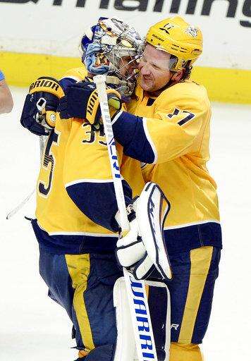 Nashville Predators goaltender Pekka Rinne (35), of Finland, celebrates with left wing Scott Hartnell (17) after the Predators defeated the Minnesota Wild in a shootout in an NHL hockey game Tuesday, March 27, 2018, in Nashville, Tenn. The Predators won 2-1. (AP Photo/Mark Zaleski) The Associated Press