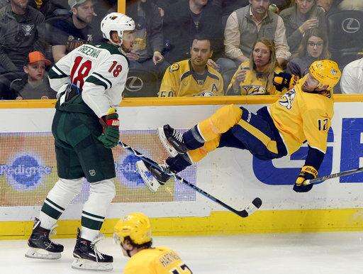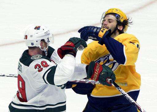 Minnesota Wild defenseman Nate Prosser (39) shoves Nashville Predators right wing Ryan Hartman, right, during the second period of an NHL hockey game Tuesday, March 27, 2018, in Nashville, Tenn. (AP Photo/Mark Zaleski) The Associated Press
