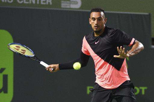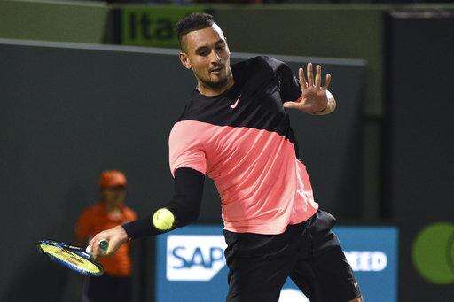 Nick Kyrgios, of Australia, returns a shot to Alexander Zverev, of Germany, during the Miami Open tennis tournament Tuesday, March 27, 2018, in Key Biscayne, Fla. Zverev won 6-4, 6-4. (AP Photo/Gaston De Cardenas)