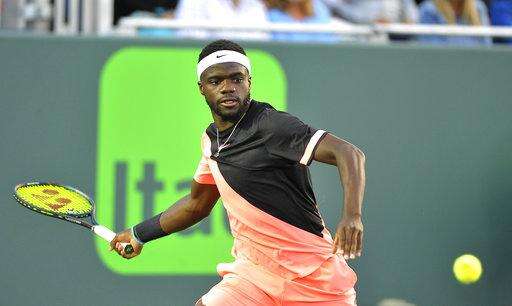 Frances Tiafoe, of the United States, returns a shot to Kevin Anderson, of South Africa, during the Miami Open tennis tournament Tuesday, March 27, 2018, in Key Biscayne, Fla. Anderson won 7-6 (3), 6-4. (AP Photo/Gaston De Cardenas)