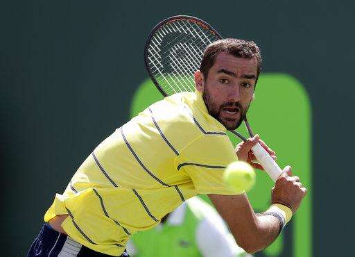 Marin Cilic, of Croatia, eyes a return to John Isner during the Miami Open tennis tournament, Tuesday, March 27, 2018, in Key Biscayne, Fla. Isner won 7-6 (0), 6-3. (AP Photo/Lynne Sladky)