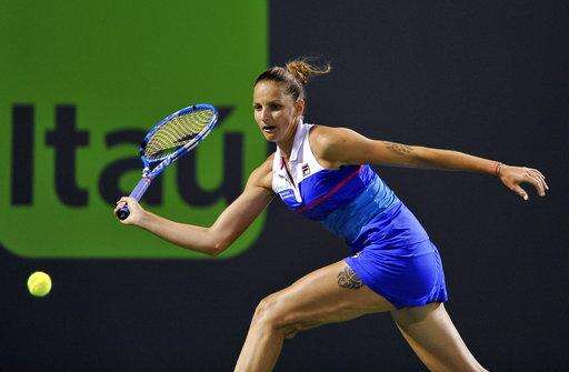 Karolina Pliskova, of the Czech Republic, prepares to hit a forehand to Victoria Azarenka, of Belarus, during the Miami Open tennis tournament Tuesday, March 27, 2018, in Key Biscayne, Fla. Azarenka won 7-5, 6-3. (AP Photo/Gaston De Cardenas)