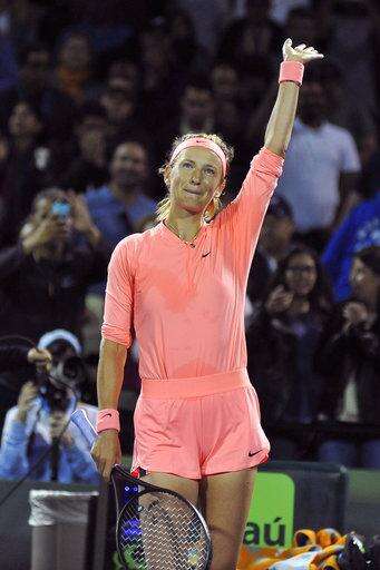 Victoria Azarenka, of Belarus, waves to the crowd after defeating Karolina Pliskova, of the Czech Republic, during the Miami Open tennis tournament Tuesday, March 27, 2018, in Key Biscayne, Fla. Azarenka won 7-5, 6-3. (AP Photo/Gaston De Cardenas)