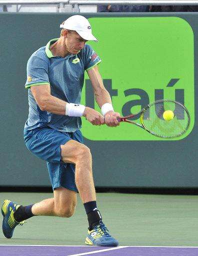 Kevin Anderson, of South Africa, returns a shot to Frances Tiafoe, of the United States, during the Miami Open tennis tournament Tuesday, March 27, 2018, in Key Biscayne, Fla. Anderson won 7-6 (3), 6-4. (AP Photo/Gaston De Cardenas)