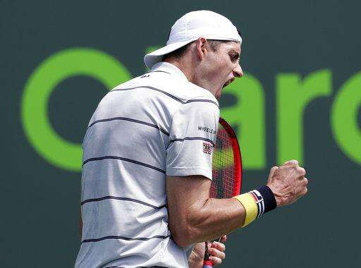 John Isner reacts after winning a point against Marin Cilic, of Croatia, during the Miami Open tennis tournament, Tuesday, March 27, 2018, in Key Biscayne, Fla. Isner won 7-6 (0), 6-3. (AP Photo/Lynne Sladky)