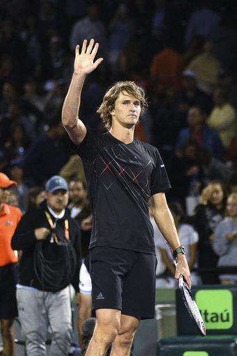 Alexander Zverev, of Germany, waves to the crowd after defeating Nick Kyrgios, of Australia, at the Miami Open tennis tournament Tuesday, March 27, 2018, in Key Biscayne, Fla. Zverev won 6-4, 6-4. (AP Photo/Gaston De Cardenas)