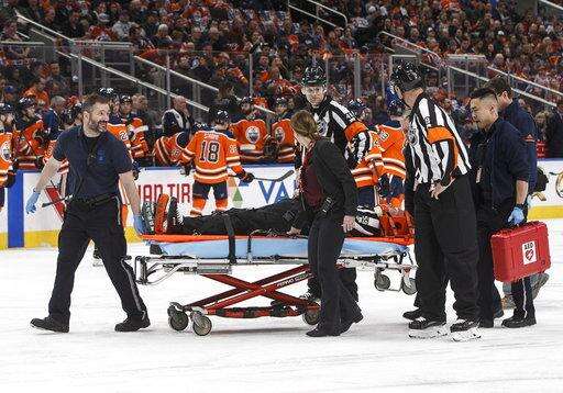 Linesman Steve Barton was stretchered off following a collision with McDavid in the first period. Columbus' Zach Werenski ran into McDavid and sent him flying into Barton, who hit his head hard on the ice. Sportsnet reported that Barton was taken to a hospital, where he was able to speak with doctors and move all extremities.