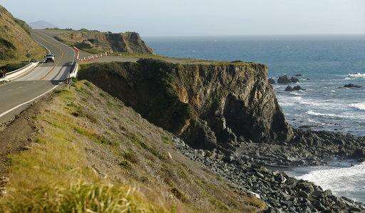 A truck drives by the pullout where the SUV of Jennifer and Sarah Hart was recovered off the Pacific Coast Highway, near Westport, Calif., Wednesday, March 28, 2018. The bodies of the two women and three of their adopted children were recovered after the vehicle plunged over the cliff Monday, while three more of their children, Devonte Hart, 15, Hannah Hart, 16, and Sierra Hart, 12, have not been found. (Alvin Jornada/The Press Democrat via AP)