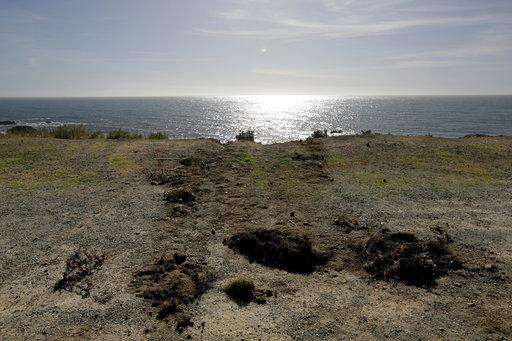 Tracks lead away from the edge of the cliff Wednesday, March 28, 2018, where the SUV of Jennifer and Sarah Hart went off the Pacific Coast Highway near Westport, Calif., on Monday. The bodies of the two women and three of their adopted children were recovered from the vehicle, while three more of their children, Devonte Hart, 15, Hannah Hart, 16, and Sierra Hart, 12, have not been found. (Alvin Jornada/The Press Democrat via AP)