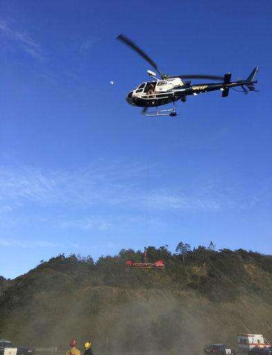 This Tuesday, March 27, 2018, photo provided by the California Highway Patrol shows a helicopter hovering over the scene where a vehicle plunged off a cliff in Northern California near Mendocino, Calif. The California Highway Patrol identified the adult victims Wednesday as Jennifer Hart and Sarah Hart, who died along with a few other children. (California Highway Patrol via AP)