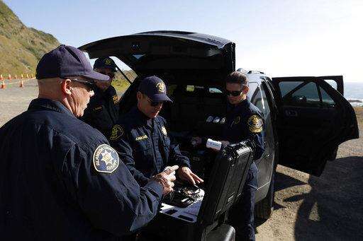 Members of the Alameda County Sheriff's Office drone team pack up their equipment after a search for three missing children Wednesday, March 28, 2018, at the site where the bodies of Jennifer and Sarah Hart and three of their adopted children were recovered two days earlier, after the family's SUV plunged over a cliff at a pullout on the Pacific Coast Highway near Westport, Calif. Three of the children, Devonte Hart, 15, Hannah Hart, 16, and Sierra Hart, 12, have not been found. (Alvin Jornada/The Press Democrat via AP)