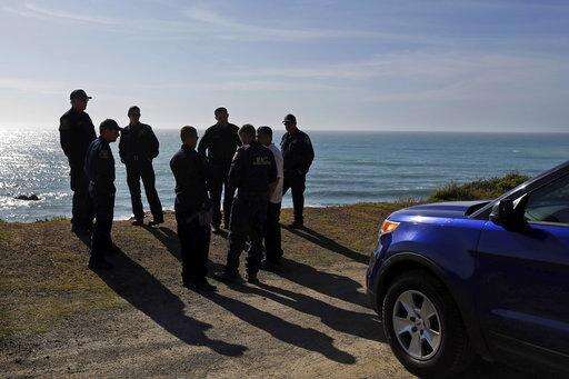 California Highway Patrol officers and deputy sheriffs from Mendocino and Alameda counties gather after a search for three missing children Wednesday, March 28, 2018, at the site where the bodies of Jennifer and Sarah Hart and three of their adopted children were recovered two days earlier, after the family's SUV plunged over a cliff at a pullout on the Pacific Coast Highway near Westport, Calif. Three of the children, Devonte Hart, 15, Hannah Hart, 16, and Sierra Hart, 12, have not been found. (Alvin Jornada/The Press Democrat via AP)