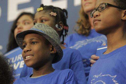CORRECTS SOURCE-This photo taken March 25, 2016, shows a young supporter holding up a sign as then Democratic presidential candidate Bernie Sanders, I-Vt., addressed the crowd during a rally at the Moda Center in Portland, Ore. Devonte Hart is one of three children who are missing after their siblings and parents were killed when their SUV plunged off a California cliff. Hart had gained fame when a picture of him hugging a white police officer during a protest went viral. (AP Photo/Steve Dykes)